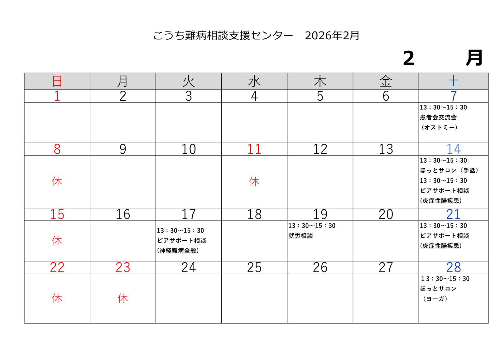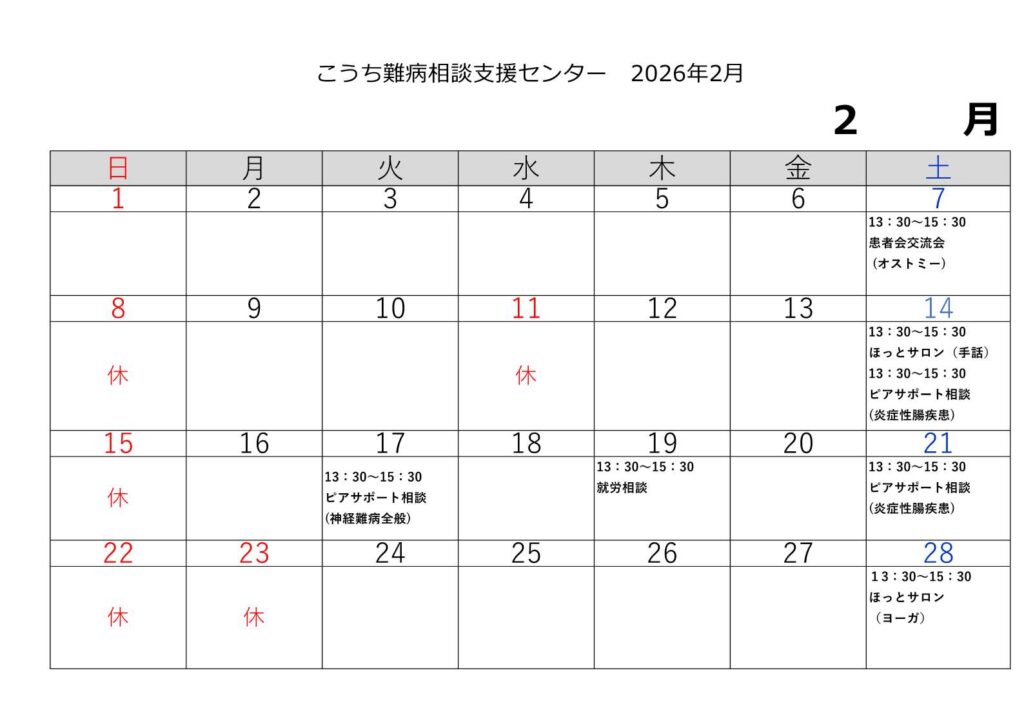 おしらせ・イベント情報, 今月の催し 2026年2月の催し ※画像をクリックすると拡大することができます。 ※各事業の詳細は、「おしらせ・イベント情報」をご覧ください。 2026-02-13 | Posted in おしらせ・イベント情報, 今月の催し | Comments Closed 関連記事 臨時休業のお知らせ1月31日(土) 年末年始の休業のお知らせ 出張相談のご案内・幡多福祉保健所管内(令和8年1月21日) 「病気のある子どもと家族の交流会・ピアサポート相談」のご案内(中央東福祉保健所管内) 「筋萎縮性側索硬化症(ALS)」医療学習会等のご案内(R8年1月31日) < 臨時休業のお知らせ1月31日(土)